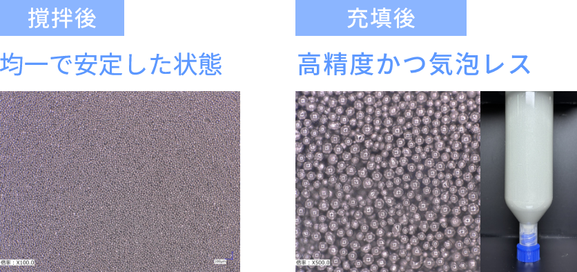 充填量を微細に調整でき、常に高い均一性を保てます。事例 ~高精度な撹拌・脱泡・充填~