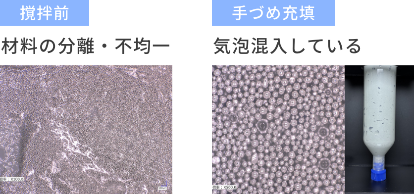 - 手詰めでは品質のばらつきや気泡混入が心配